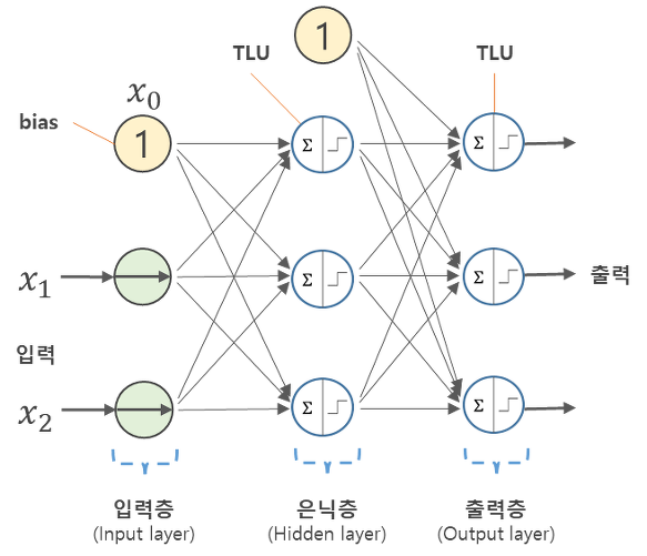 이 모델의 구조를 인간의 두뇌 단위인 뉴런을 흉내내어 만들어서 신경망 알고리즘이라고 합니다. 초기에 신경망이라 불렸고 이후에 신경망이 복잡해지면서 딥러닝이라 명명하게 되었습니다.