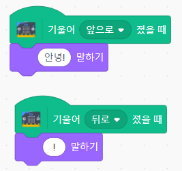 아래 그림6. 코드는 마이크로비트의 자이로센서를 이용해 기울기를 감지하면 픽토블럭의 곰돌이 캐릭터에 말풍선이 생기는 코드입니다.