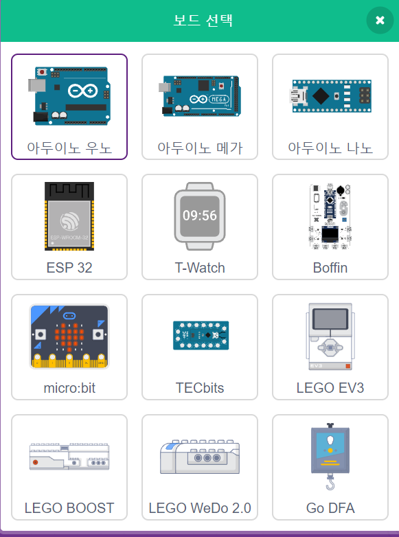 픽토블록을 실행하시고 메뉴에서 보드를 클릭하고 아래 그림1과 같은 팝업창에서 마이크로비트를 선택합니다.