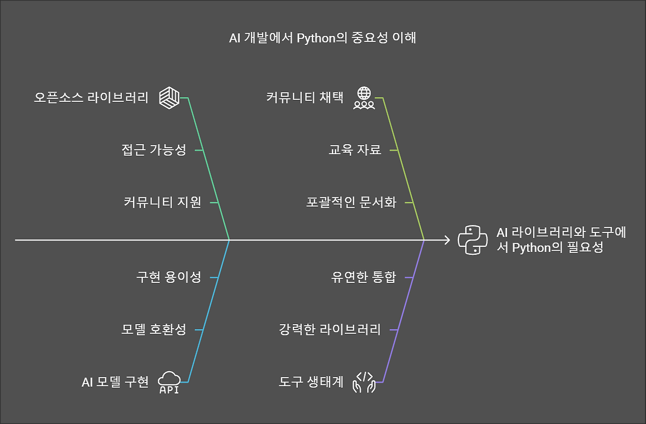 우선 파이썬이 왜 필요한지는 다들 아시겠지만 인공지능 라이브러리들이 많이 개발되어 오픈소스로 공개되었다는 것에 그 필요성이 큽니다.