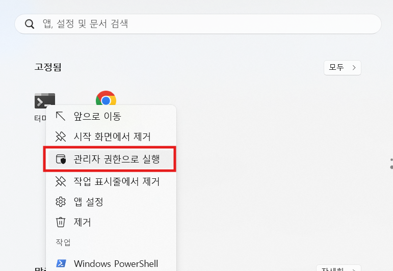 앞에서 "설치된 앱"에서 Visual Studio Code를 검색해서 기존에 설치된 것을 제거합니다. VS Code 프로그램을 choco로 다시 설치하겠습니다. 이때 관리자 권한 터미널창에서 설치해야 합니다.
