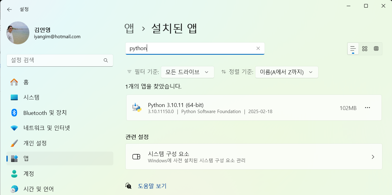 다음으로는 윈도우의 설치된 앱에서 python을 검색해서 기존에 설치된 파이썬이 있다면 설치 제거를 해주셔야 합니다.