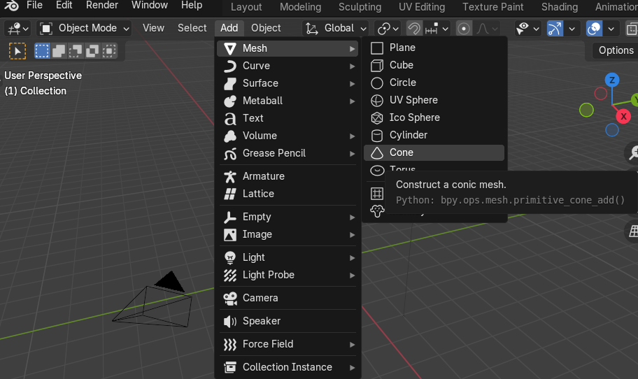 - bpy.ops.mesh.primitive_cone_add(): 이 명령어는 밑면은 둥글고 끝은 뾰족한 모양의 원뿔을 3D 뷰포트의 중심에 만들어줍니다.