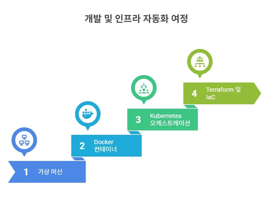 가상머신에서 시작하여 Docker 컨테이너, Kubernetes, 그리고 Terraform과 IaC에 이르기까지, 개발 환경과 인프라 관리 자동화 기술은 놀라운 속도로 발전해왔습니다. 이러한 도구들은 개발 생산성을 높이고, 안정적인 서비스 운영을 가능하게 하며, 복잡한 인프라를 효율적으로 관리할 수 있도록 돕습니다.