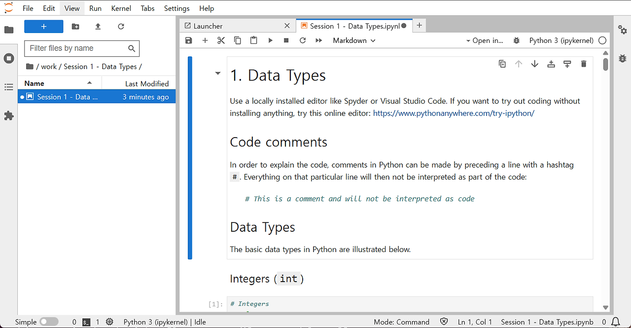 /work폴더를 클릭하면 python101 폴더의 파일과 폴더들이 보일 것이고 아래와 같이 세션1의 쥬피터노트북 파일을 열 수 있습니다. 이렇게 열어서 파일을 실행하는 환경이 쥬피터랩입니다.