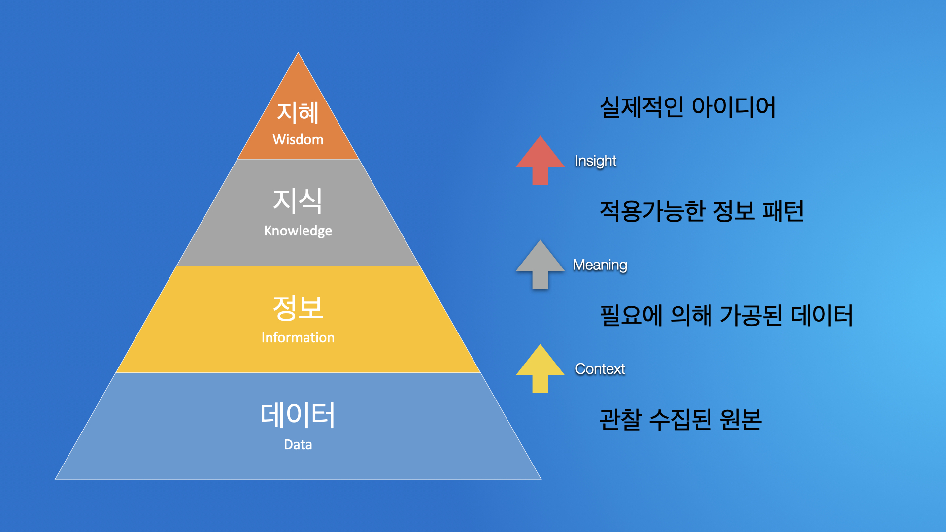정보에서 지혜로 발전하려면 정보가 갖고 있는 의미를 찾아서 그 의미 해석을 통해 어떻게 활용될 수 있는지 가능성을 내포하는 상태가 됩니다.